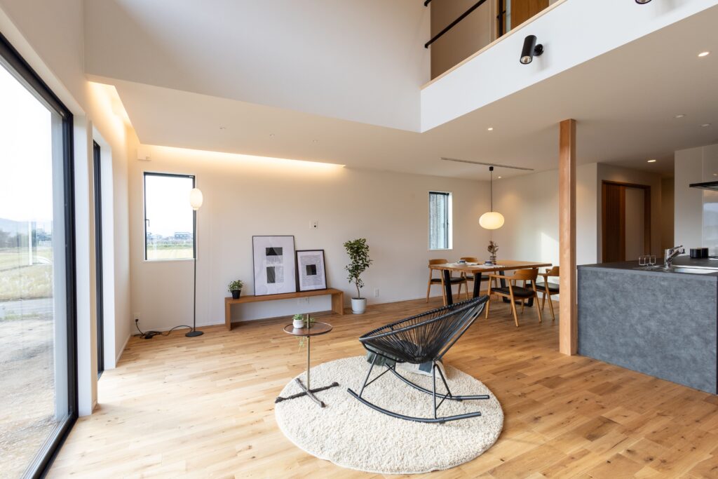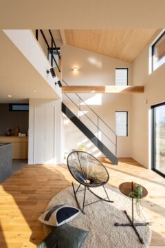 約20帖のLDKは、勾配天井と吹き抜け、広い窓で光と影が交差する。